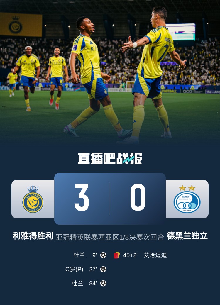 亞冠精英聯(lián)賽西亞區(qū)1/8決賽次回合,C羅進球,杜蘭梅開二度,利雅得勝利3-0德黑蘭獨立,晉級亞冠八強。