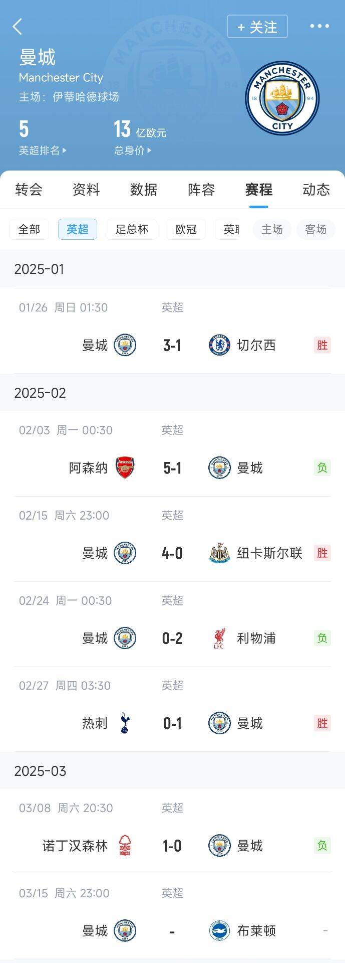 曼城在上周末的英超0-1不敵森林,近6輪比賽3勝3負(fù)。