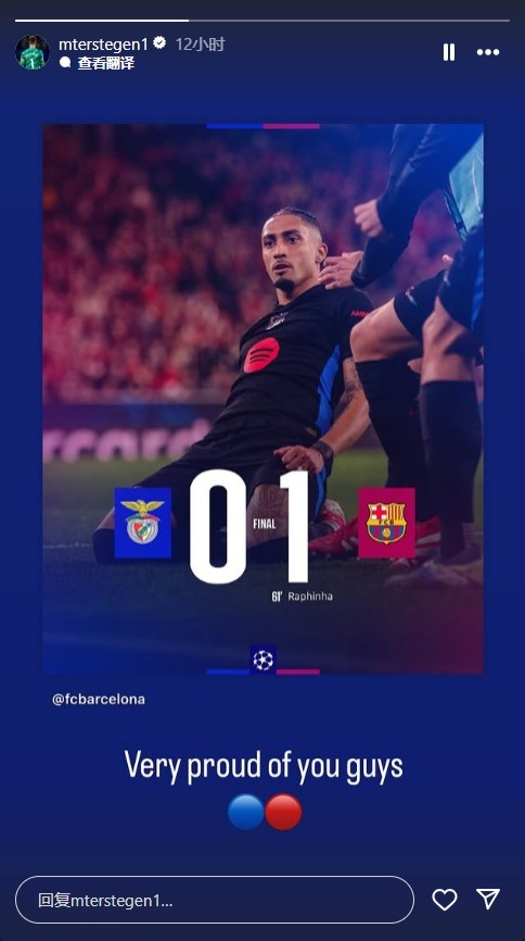 北京時間周四凌晨,巴薩客場1-0戰(zhàn)勝本菲卡,拉菲尼亞打進制勝球。賽后,巴薩門將特爾施特根在個人社交媒體上曬出了本場比賽結果,并配文:“為你們而感到驕傲。”