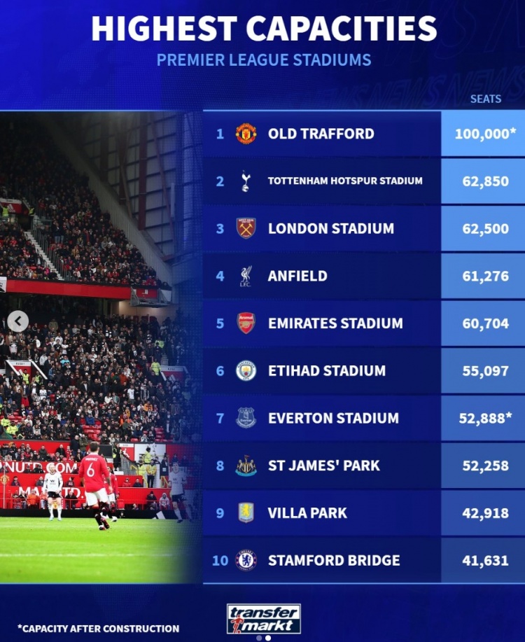 3月11日訊 曼聯(lián)已經(jīng)官宣將建造能夠容納10萬人的新主場,《轉(zhuǎn)會市場》也列出了數(shù)年后的英超各隊主場容量榜。