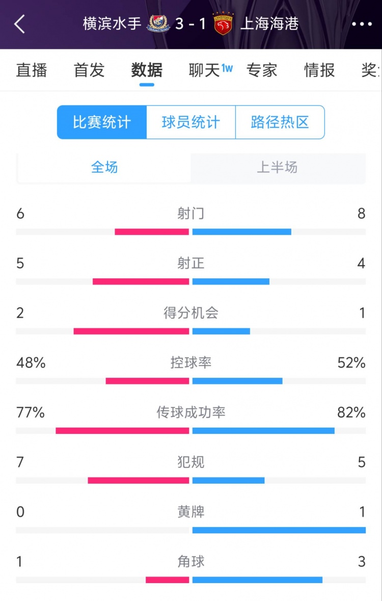 半場數據方面,射門數海港8-6領先,射正4-5落后,控球率52%、傳球成功率82%均高于橫濱。
