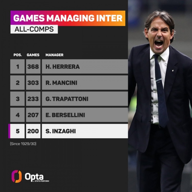 小因扎吉達(dá)成執(zhí)教國(guó)米各項(xiàng)賽事200場(chǎng)里程碑,是隊(duì)史第5人