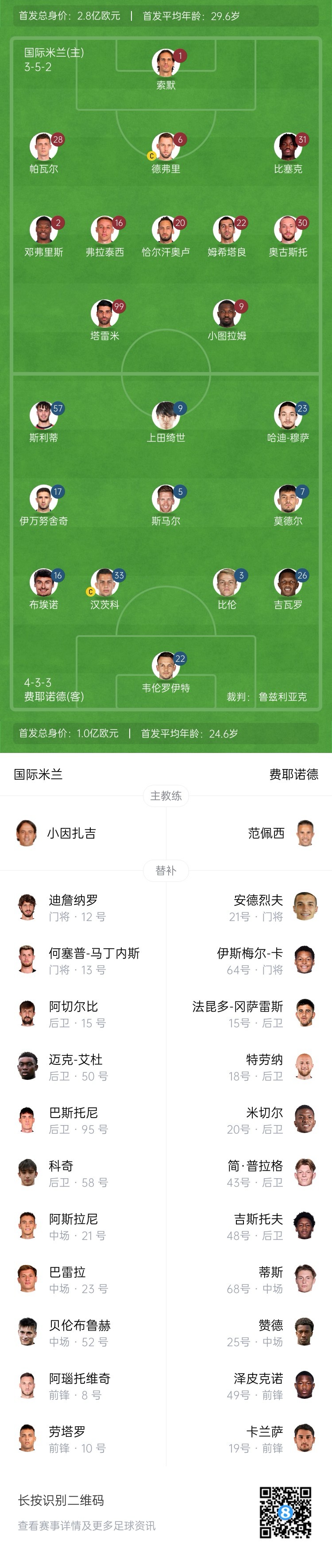 國米原定首發(fā)為德弗里,開場前10分鐘消息,德弗里熱身出現(xiàn)傷情,阿切爾比進入首發(fā)。