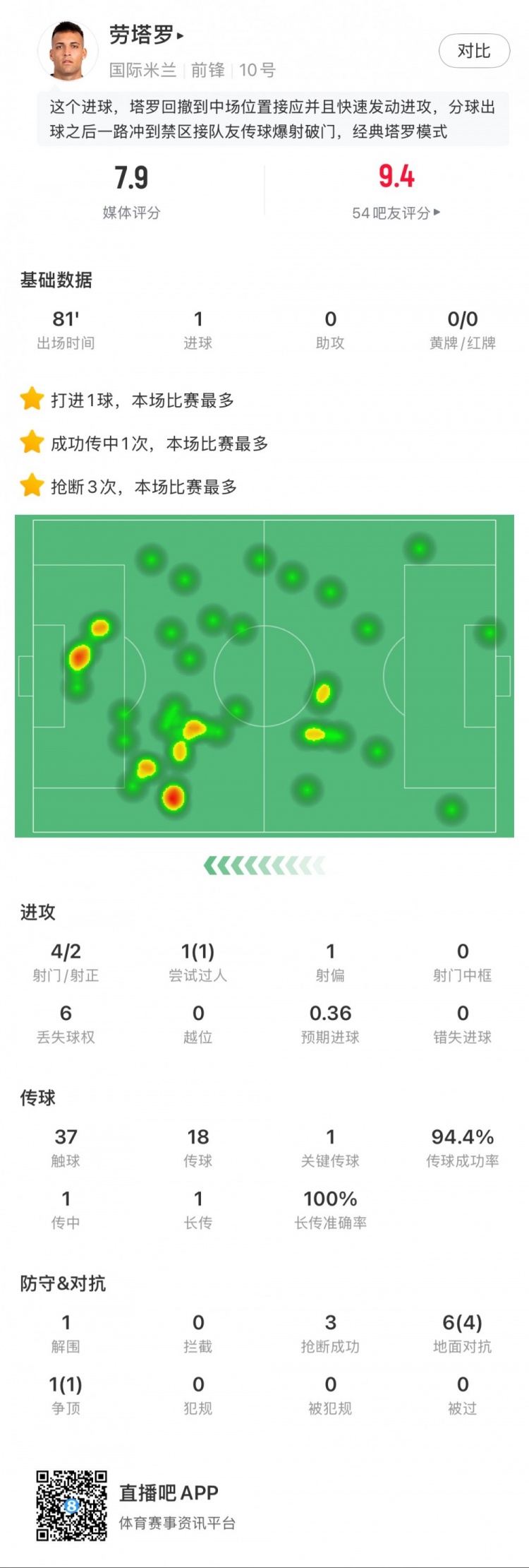 勞塔羅本場數(shù)據(jù):1粒進(jìn)球,4次射門2次射正,3次搶斷