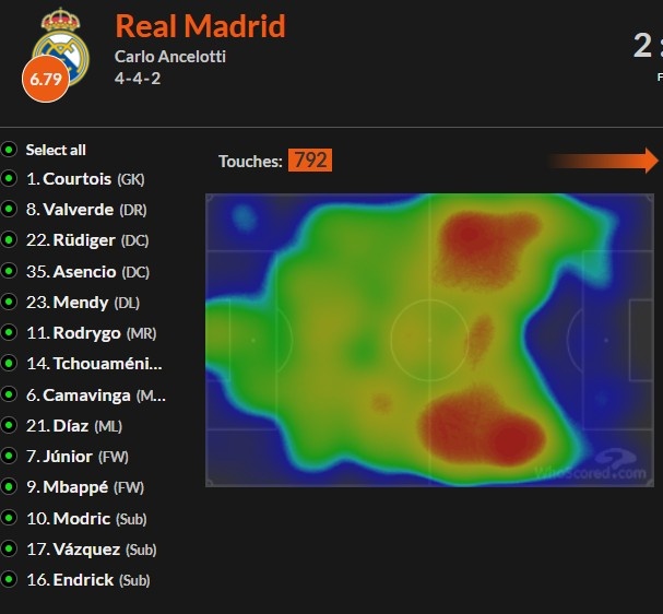 可以想到,因?yàn)樵谌鄙俅笾袖h的情況下,他們不可能按照過去有中鋒時(shí)(哪怕是何塞-盧)那樣的傳中、搶點(diǎn)、后排套上爭(zhēng)搶機(jī)會(huì)模式來打了。維尼修斯、羅德里戈、包括姆巴佩都是在突擊方面遠(yuǎn)勝過被迫的站樁方面效率選手,因此,他們也會(huì)自主扯到邊路來踢球。