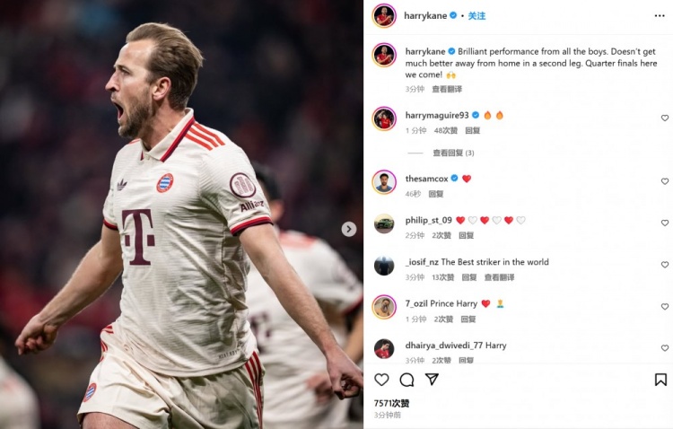 凱恩也在賽后通過(guò)社媒曬出自己的比賽照,并配文:“全隊(duì)交出精彩表現(xiàn),沒有比這更棒的客場(chǎng)次回合了。八強(qiáng)戰(zhàn)我們來(lái)了!”