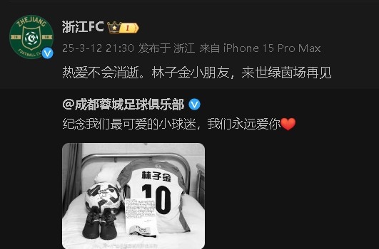 浙江隊(duì)社媒發(fā)文悼念:熱愛不會(huì)消逝。林子金小朋友,來世綠茵場(chǎng)再見。