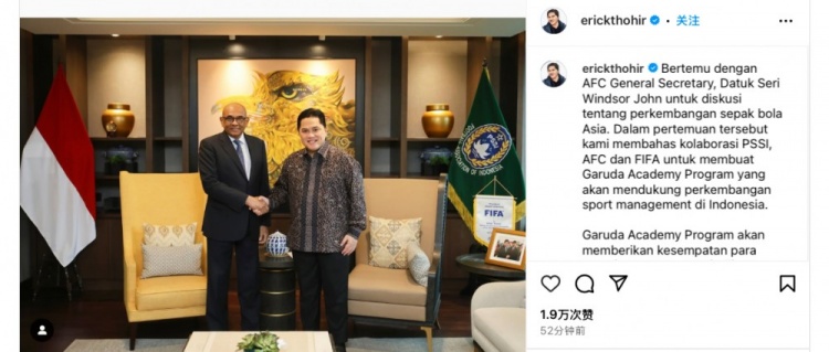 托希爾在社媒配文寫道:“今日會(huì)見了亞足聯(lián)秘書長(zhǎng)拿督溫莎-約翰,會(huì)上我們共同就亞洲足球未來的發(fā)展方向進(jìn)行探討,此外還討論了印尼足協(xié)與亞足聯(lián)、國(guó)際足聯(lián)合作開辦的雄鷹足球?qū)W院項(xiàng)目,以進(jìn)一步促進(jìn)印尼足球的發(fā)展?!?/p>