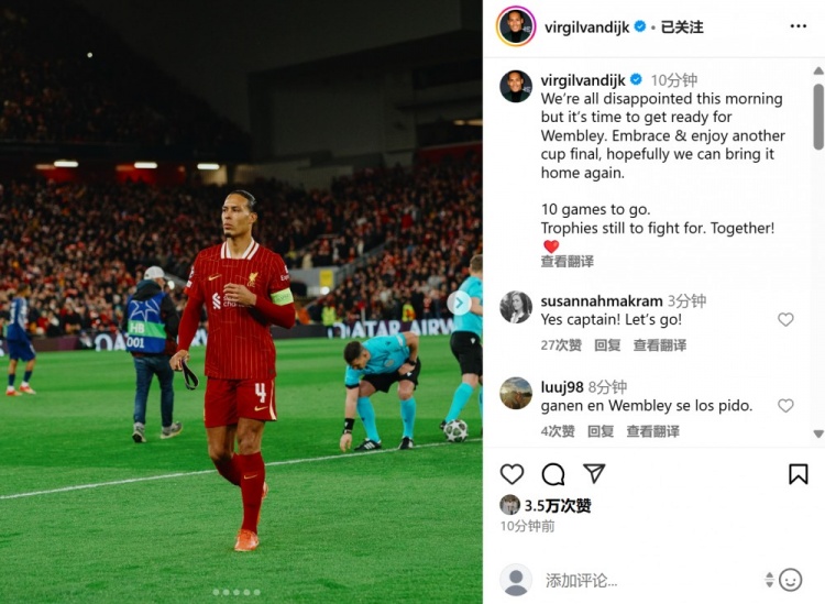 范迪克也在社媒發(fā)文寫道:“今天早上我們每個人都很失望,但現(xiàn)在是時候為溫布利球場的決賽做好準備了。擁抱并享受又一場決賽,希望我們能再次把獎杯帶回家。賽季還剩10場比賽,還要為冠軍而拼搏。我們一起加油!”