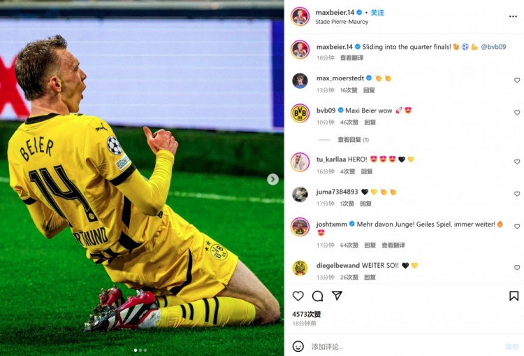 拜爾也曬出自己進(jìn)球后的滑跪慶祝照,并調(diào)侃:“一路滑進(jìn)歐冠八強(qiáng)!?????????? @多特蒙德俱樂部”。