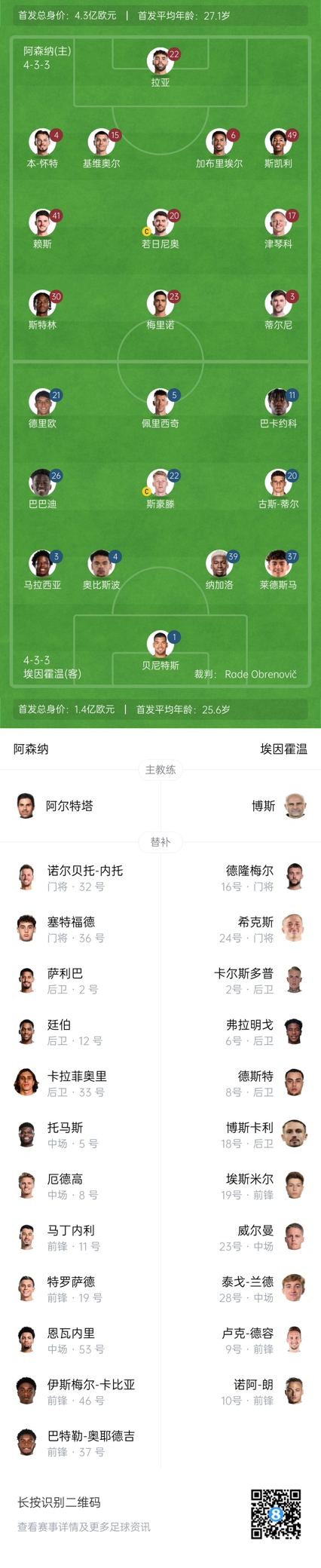 都輪換了!阿森納vs埃因霍溫首發(fā):蒂爾尼、斯凱利、斯特林先發(fā)
