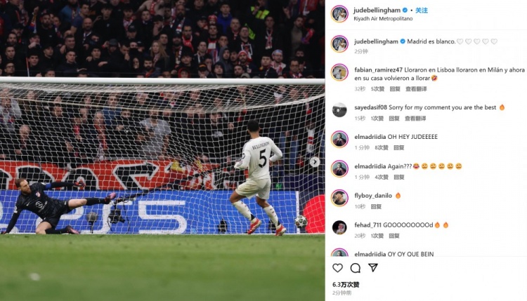 同城德比晉級!貝林厄姆曬點球破門照:馬德里是白色的!