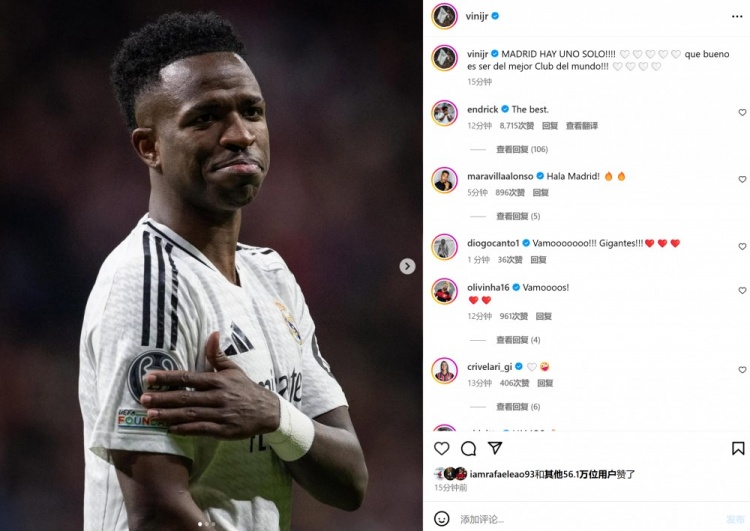 本場比賽維尼修斯罰丟一粒點(diǎn)球,賽后他在社媒曬照慶祝勝利,配文寫道:“馬德里只有唯一,能成為世界最佳俱樂部的一員是多棒的事情!”
