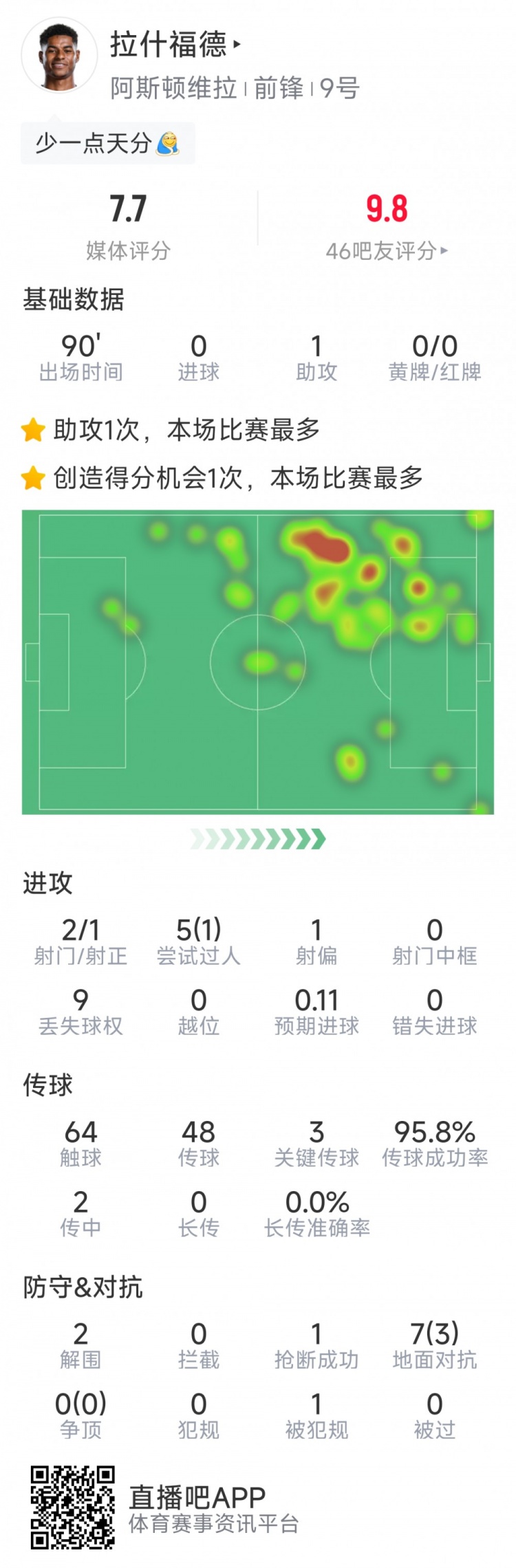 再送助攻,拉什福德本場數(shù)據(jù):1助攻,3次關(guān)鍵傳球,2次射門