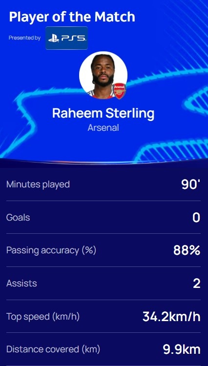 2送助攻,歐冠官方:斯特林當(dāng)選阿森納2-2埃因霍溫全場(chǎng)最佳