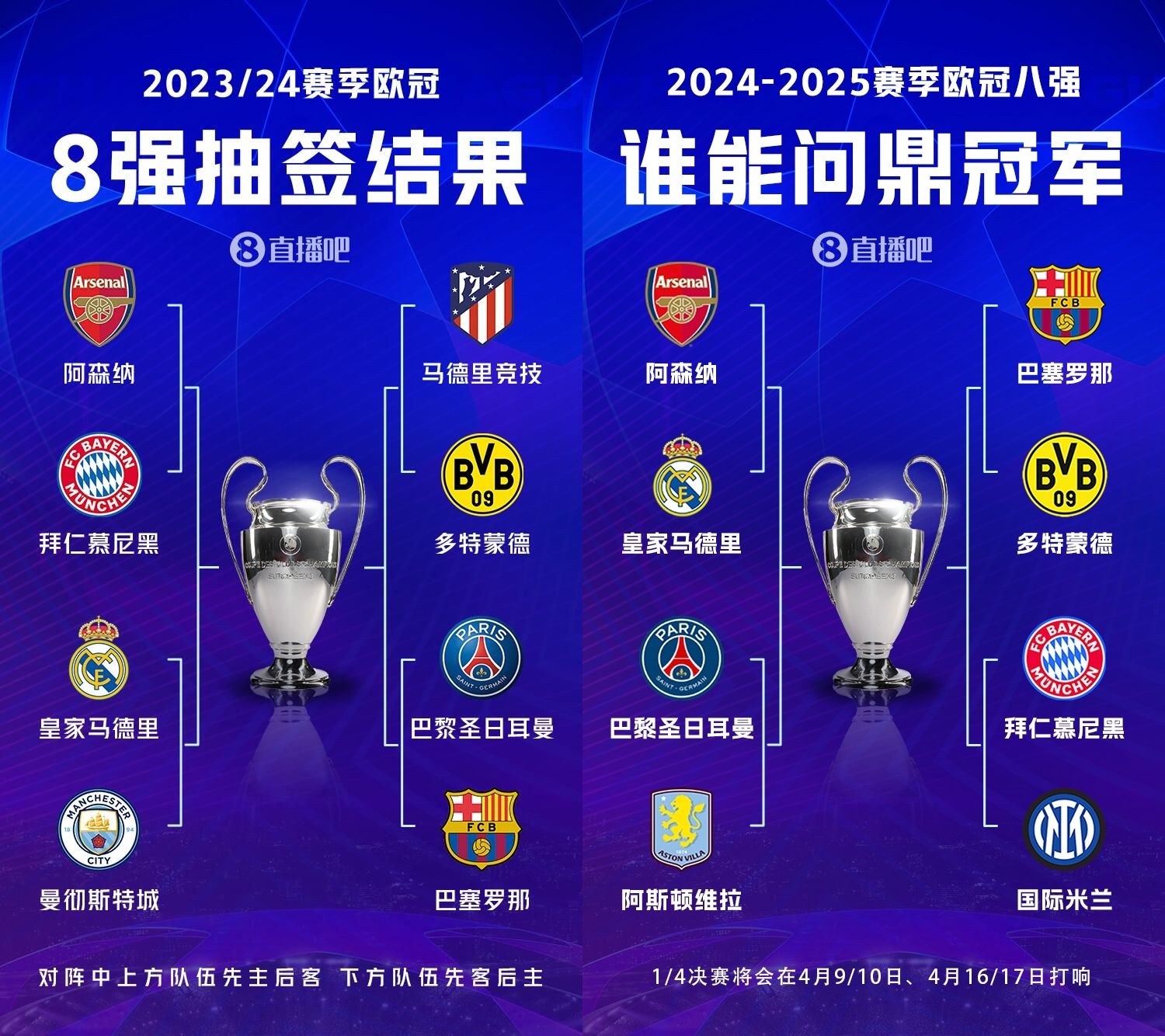 23/24賽季歐冠8強:阿森納vs拜仁,皇馬vs曼城,馬競vs多特,巴黎vs巴薩