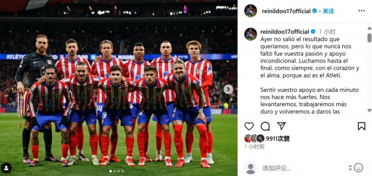 馬競(jìng)球員雷尼爾多本場(chǎng)首發(fā)出戰(zhàn),他在個(gè)人社媒曬出全隊(duì)賽前合影,配文寫(xiě)道:“昨天我們沒(méi)有得到想要的結(jié)果,但是我們從沒(méi)有缺少球迷的熱情和無(wú)條件的支持。我們一如既往拼搏到了最后一刻,因?yàn)槲覀兪邱R競(jìng)。感受到你們的支持讓我們更加強(qiáng)大,我們會(huì)再次站起來(lái),努力拼搏,并再一次帶給你們應(yīng)得的快樂(lè)。感謝大家來(lái)到球場(chǎng)支持,無(wú)論順境還是逆境,讓我們一直團(tuán)結(jié)一致,加油馬競(jìng)!”