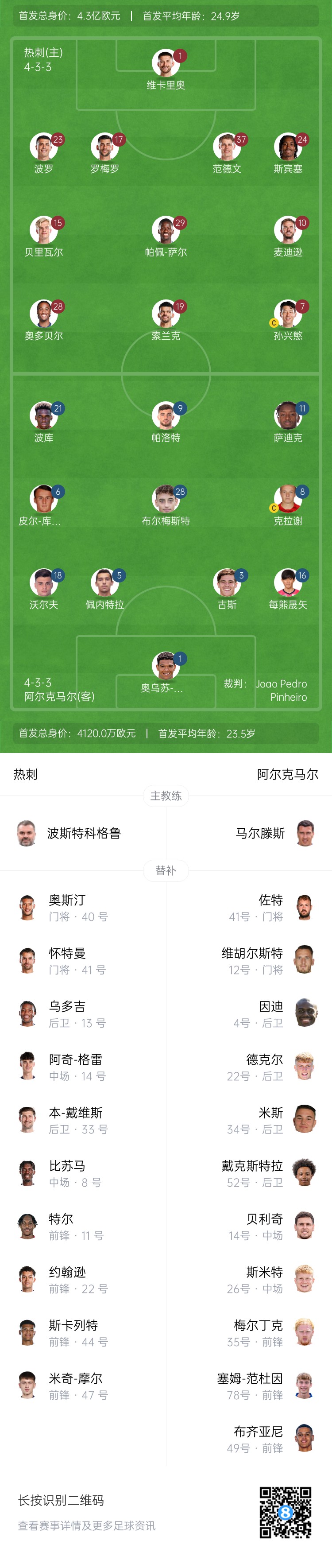 熱刺首發(fā):1-維卡里奧、23-波羅、17-羅梅羅、37-范德文、24-斯賓塞、10-麥迪遜、15-貝里瓦爾、29-帕佩-薩爾、28-奧多貝爾、19-索蘭克、7-孫興慜