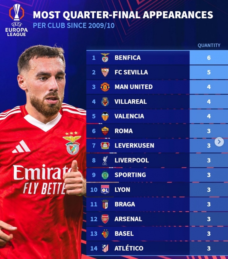 3次,羅馬、勒沃庫(kù)森、利物浦、葡體、里昂、布拉加、阿森納、巴塞爾、馬競(jìng)