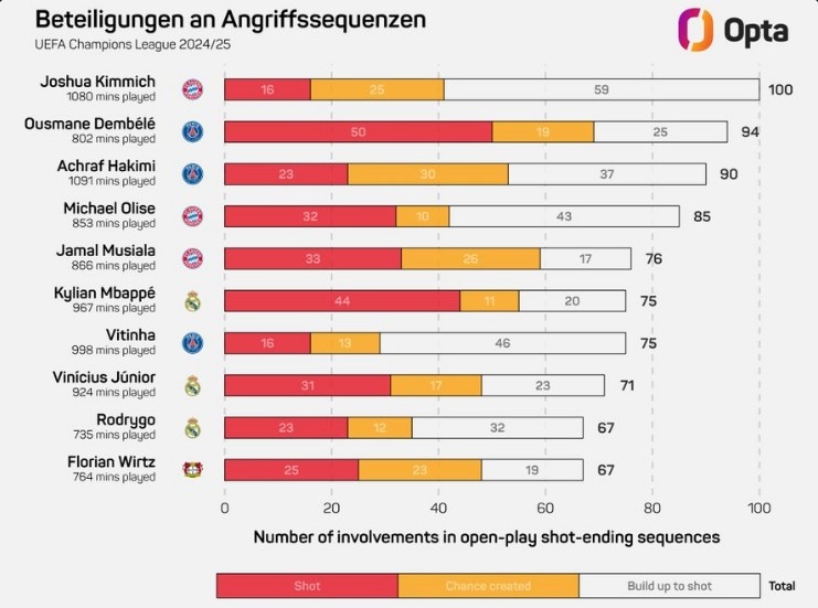 基米希本賽季歐冠100次參與形成射門的進(jìn)攻,領(lǐng)跑所有球員