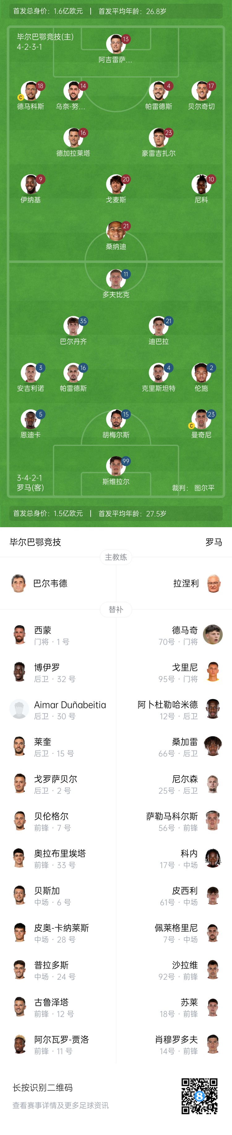 畢巴首發(fā):13-阿吉雷薩瓦拉、18-奧斯卡-德馬科斯、14-烏奈-努涅斯、4-艾托-帕雷德斯、17-尤里-貝爾奇切、16-伊尼戈-魯伊斯-德加拉萊塔、23-米克爾-豪雷吉扎爾、9-伊納基-威廉姆斯、20-烏奈-戈麥斯、10-尼科-威廉姆斯、21-馬羅安-桑納迪
