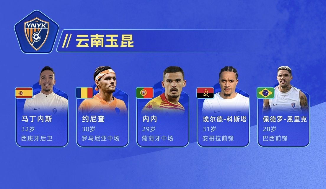 目前云南玉昆的外援有馬丁內(nèi)斯、約尼查、內(nèi)內(nèi)、佩德羅-恩里克以及埃爾德-科斯塔,其中馬丁內(nèi)斯、約尼查、內(nèi)內(nèi)、佩德羅-恩里克,四人都代表云南玉昆參加了前兩輪中超比賽,只有埃爾德-科斯塔還未出場。