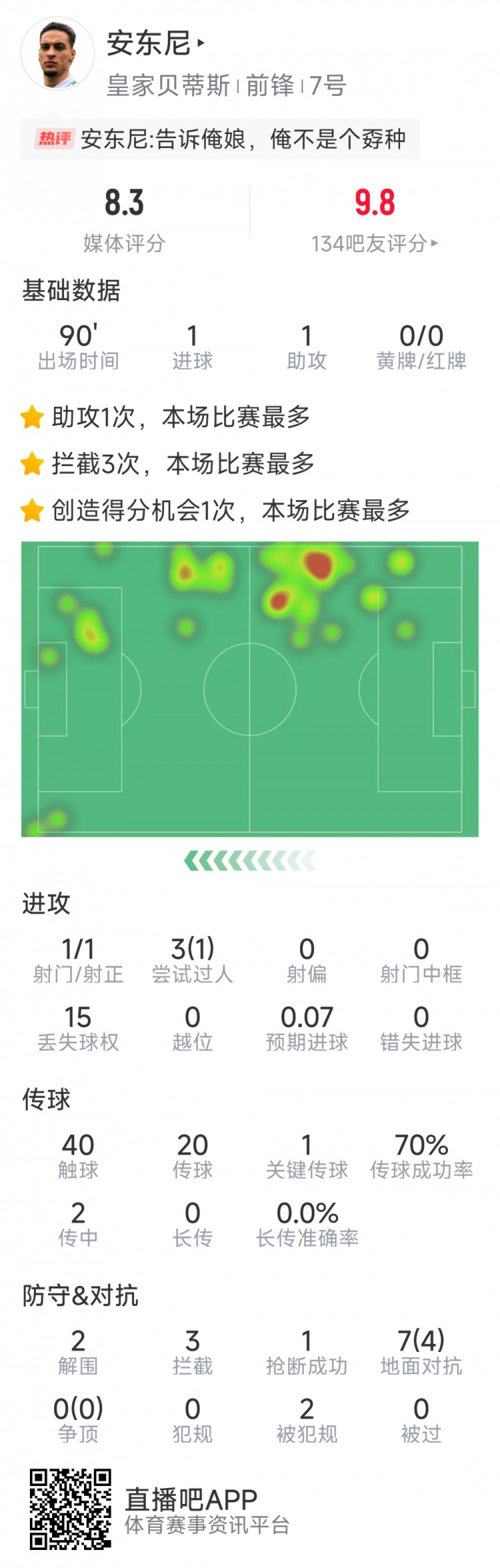 3月14日訊 在本輪歐協聯比賽中,安東尼傳射建功,以下為他在本場數據: