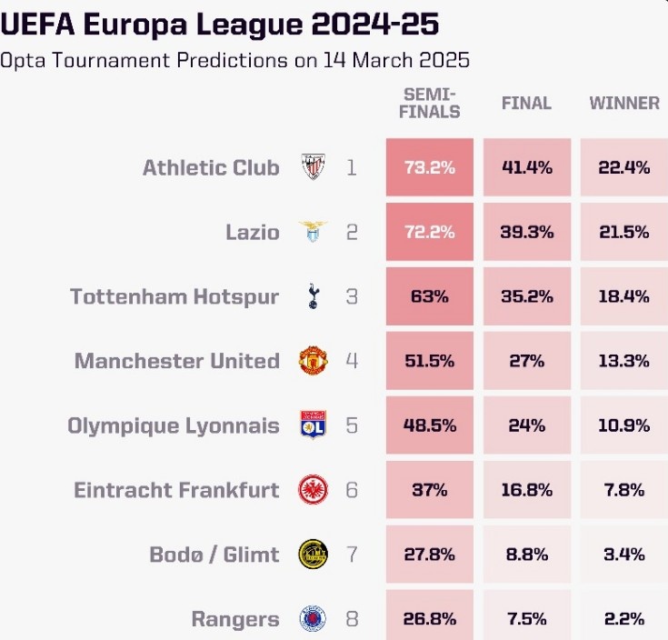 OPTA列本賽季歐聯(lián)杯奪冠概率:畢爾巴鄂競(jìng)技居首,曼聯(lián)第四