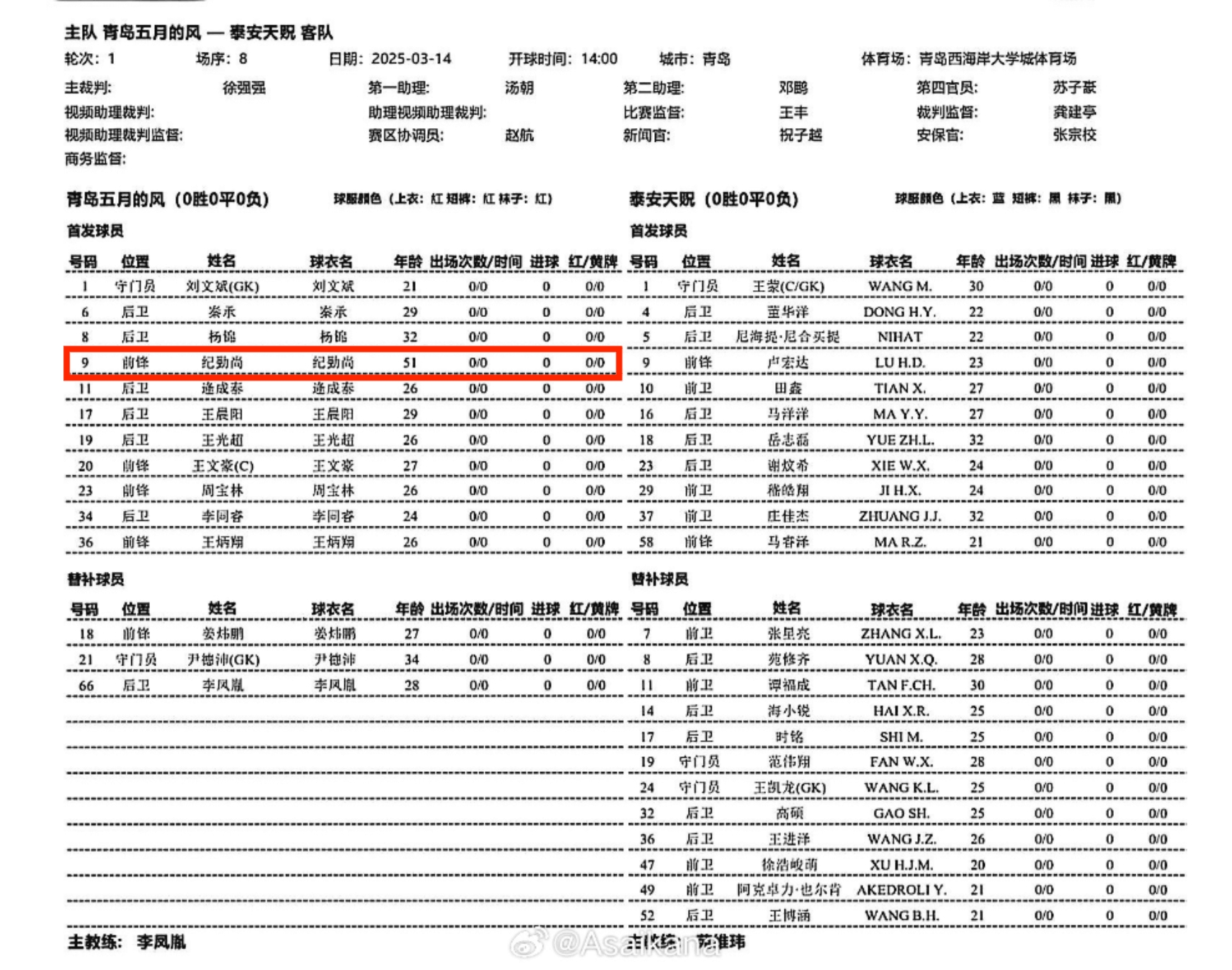 中冠球隊青島五月的風將對陣中乙球隊泰安天貺。根據(jù)首發(fā)名單,青島五月的風投資人、51歲的紀勤尚將先發(fā)出戰(zhàn),擔任前鋒。 ???