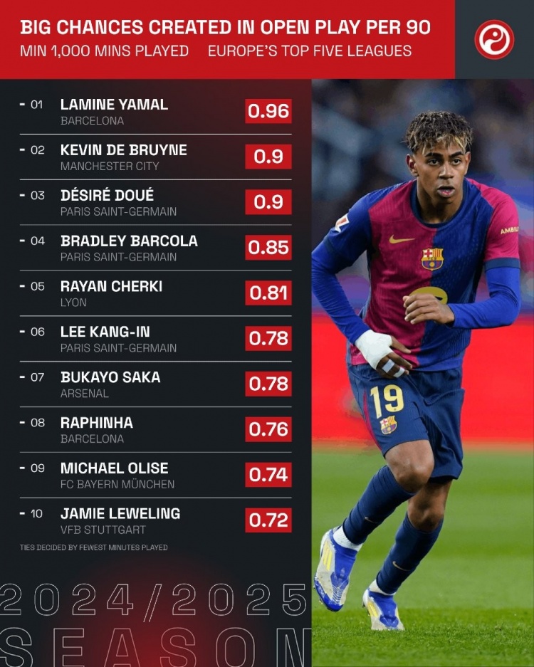 五大聯(lián)賽運(yùn)動(dòng)戰(zhàn)場(chǎng)均創(chuàng)造重大機(jī)會(huì)榜:亞馬爾居首,前6巴黎占3席