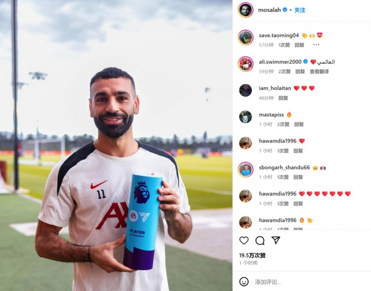 薩拉赫也通過社媒曬出了自己手捧獎杯的照片,但并未附加文字內容。這也是利物浦在歐冠出局后,法老首次更新社媒動態(tài)。