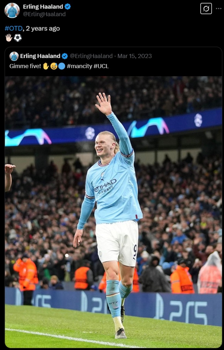 兩年前的今天哈蘭德歐冠上演五子登科,球員轉發(fā)自己當時社媒