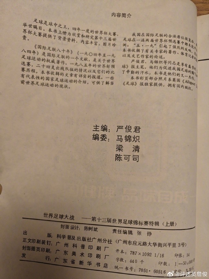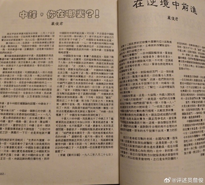 父親說,這些小薄紙片挺“解渴”的。那里肯定也有嚴(yán)俊君老總的“耕耘之作”。我開始工作后,和“足球報”很多同行成為好友,可惜那時嚴(yán)總已經(jīng)退居二線,無緣相見。今晚得知他老人家駕鶴西去,心中惆悵。謝謝您!曾經(jīng)帶我們這些球迷去“看世界”……