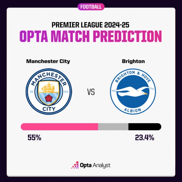 Opta對于本場比賽進行了超級計算機模擬預測,曼城獲勝概率55%,布萊頓獲勝概率23.4%,雙方戰(zhàn)平概率21.7%。