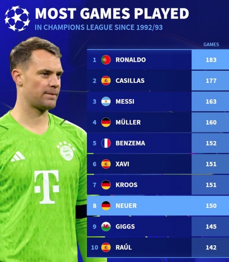 改制后歐冠出場(chǎng)榜:C羅183場(chǎng)、梅西163場(chǎng),諾伊爾150場(chǎng)列第8