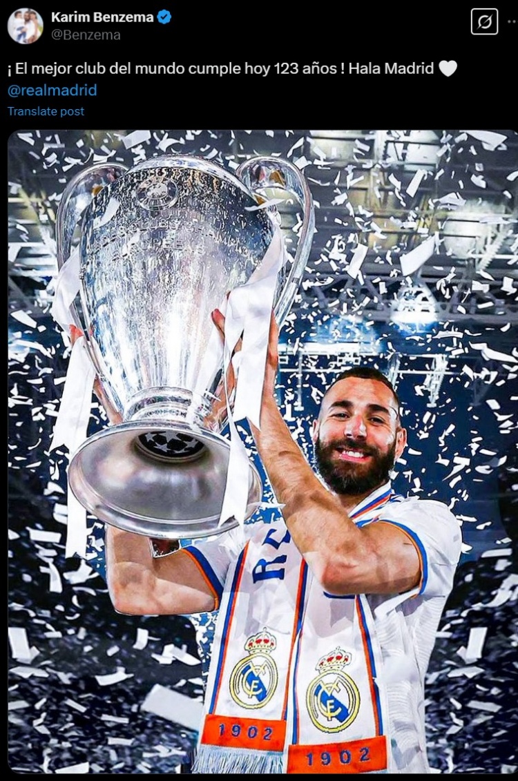 本澤馬在社媒配文寫道:“世界最佳俱樂部在今天迎來成立123周年紀念日,Hala Madrid!”