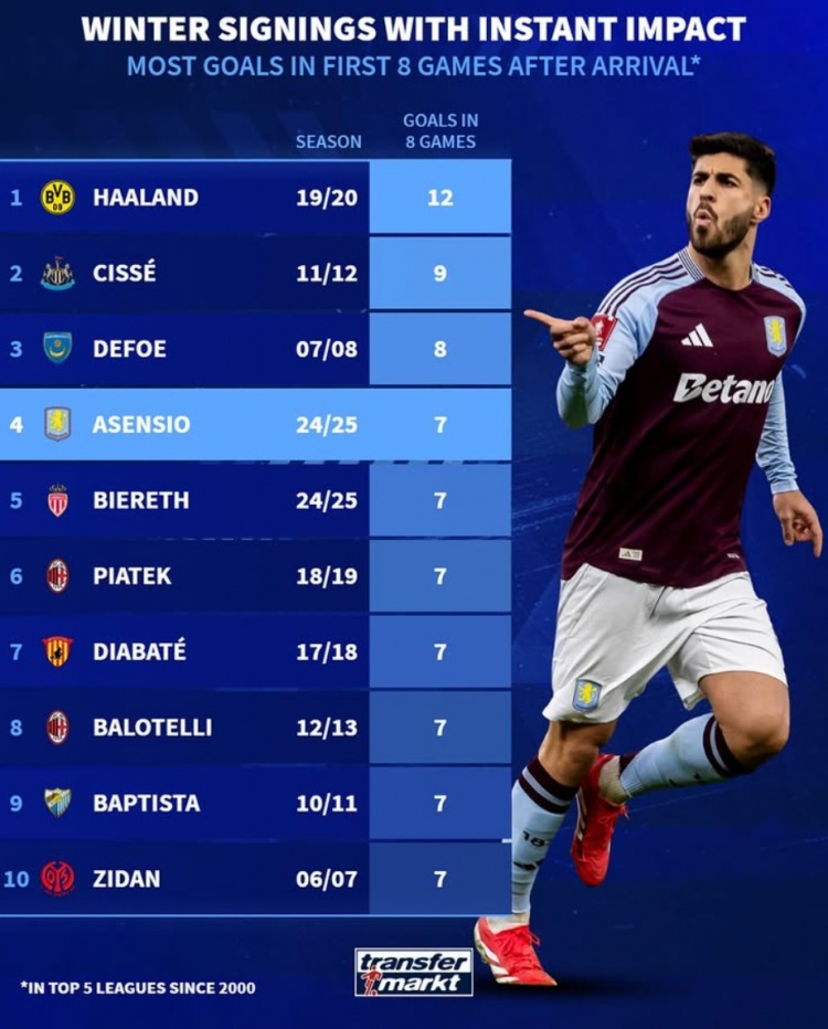 新世紀五大聯(lián)賽冬窗新援前8場:哈蘭德12球 阿森西奧&皮亞特克7球