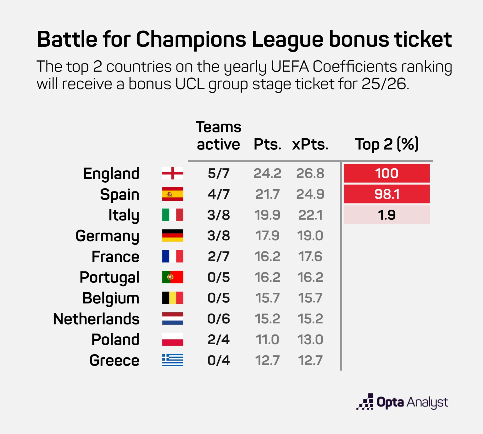 目前英格蘭手握24.25的積分,領(lǐng)先第二名西班牙2.5分??紤]到歐足聯(lián)系數(shù)分系統(tǒng)的運(yùn)作方式,在接下來(lái)的歐戰(zhàn)1/4決賽階段,只要有一支英格蘭球隊(duì)贏得一場(chǎng)比賽,就可以為英超鎖定一個(gè)額外的歐冠聯(lián)賽席位。