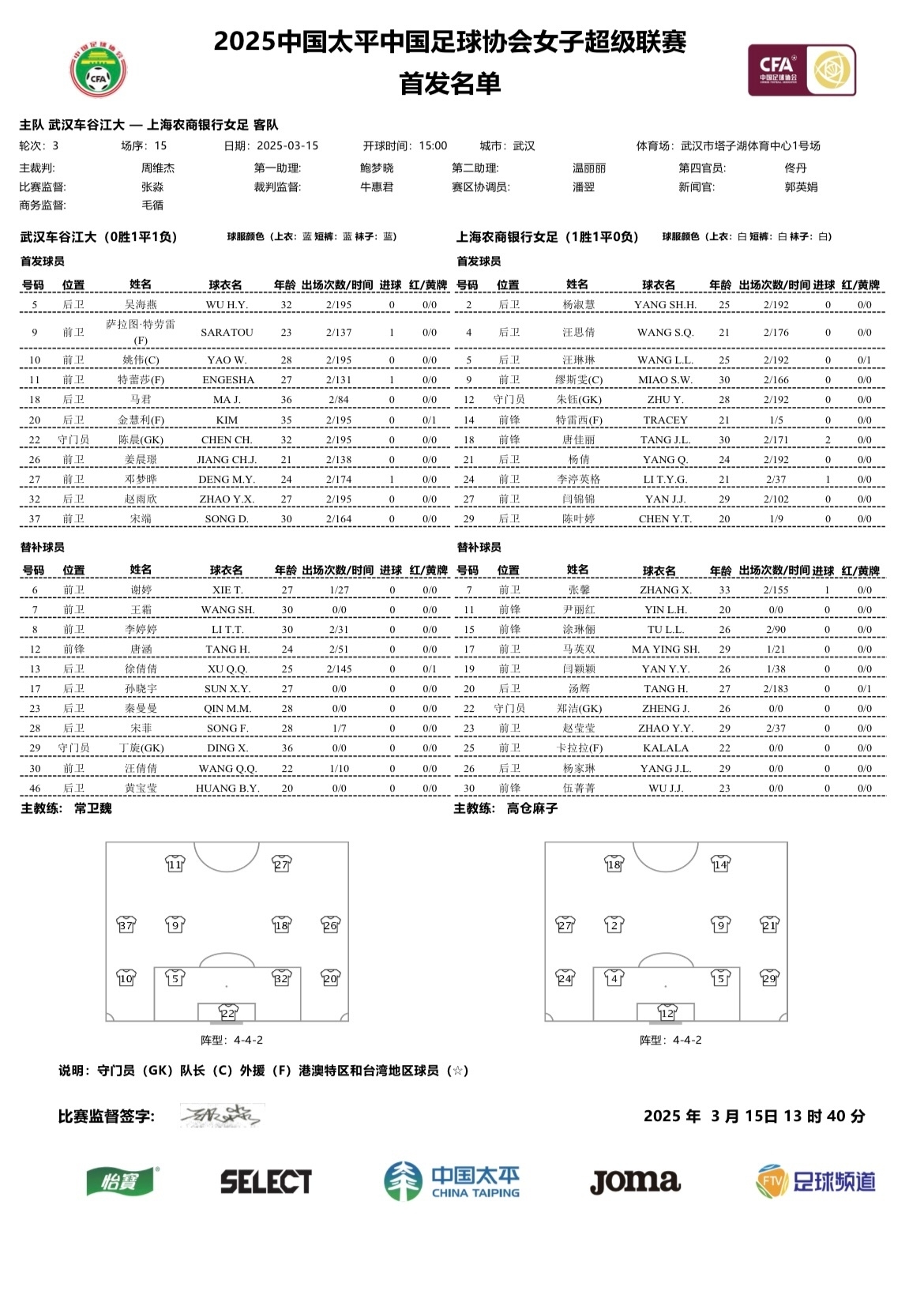 3月15日訊 本周末,女超聯(lián)賽第3輪將繼續(xù)進行,武漢車谷江大將在今天下午15:00主場迎戰(zhàn)上海農商銀行。賽前公布的出場名單中,武漢女足的王霜繼續(xù)位列替補。