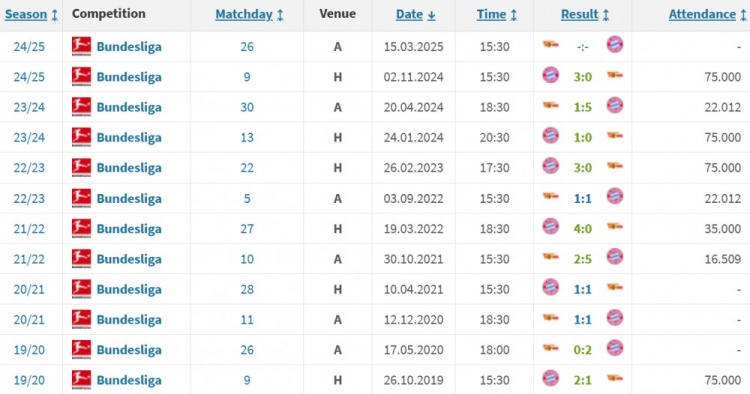 據(jù)德轉(zhuǎn)數(shù)據(jù)統(tǒng)計,兩支球隊歷史上曾11次交手(均是德甲比賽),拜仁8勝3平未嘗敗績,共計打進(jìn)28球丟7球。