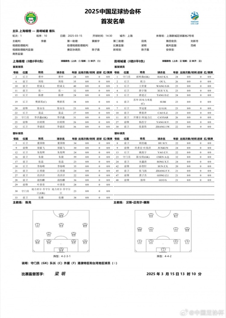 (注:比賽名單圖片取自中國足協(xié)杯官方微博)