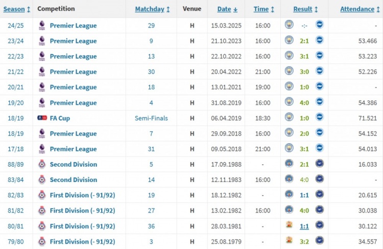 12勝2平,曼城歷史上各項賽事主場對陣布萊頓未嘗敗績
