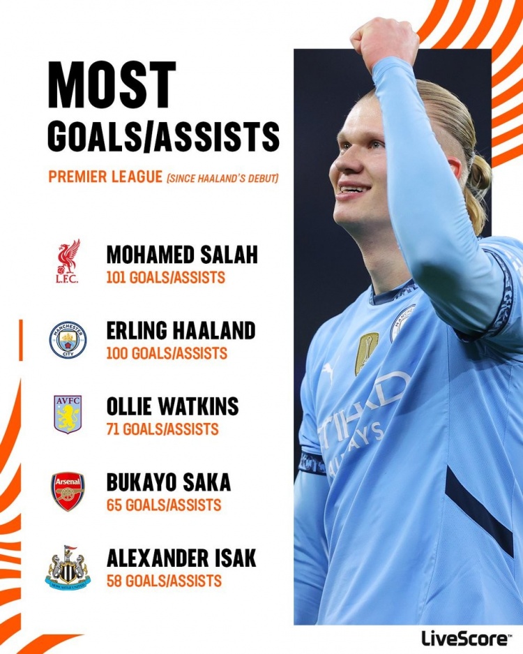 哈蘭德參與100球!同期英超參與進(jìn)球榜:薩拉赫101球,薩卡在列