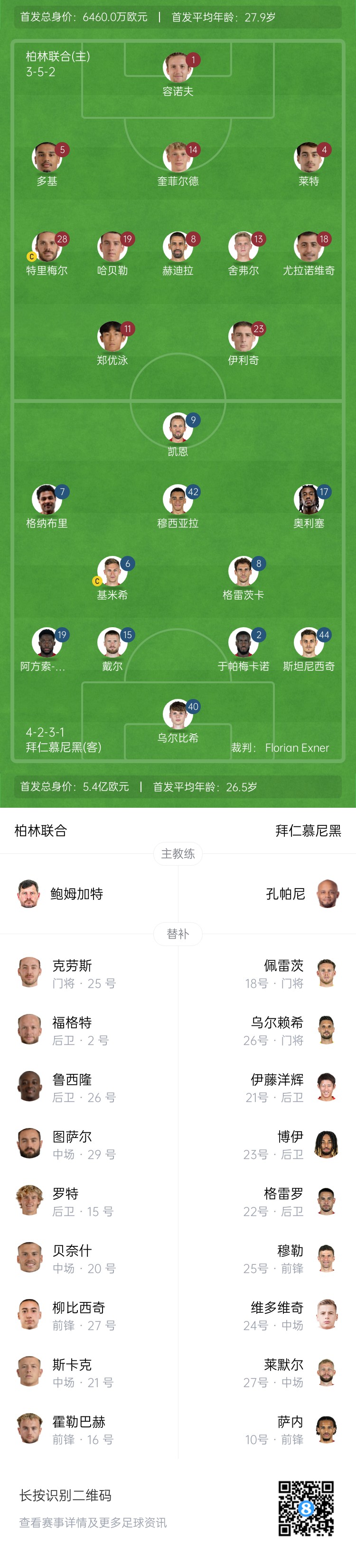 柏林聯(lián)合首發(fā):1-容諾夫、4-萊特、5-多基、14-奎菲爾德、18-尤拉諾維奇、8-拉尼-赫迪拉、13-舍費爾、11-鄭優(yōu)泳、19-哈貝勒、28-特里梅爾、23-伊利奇