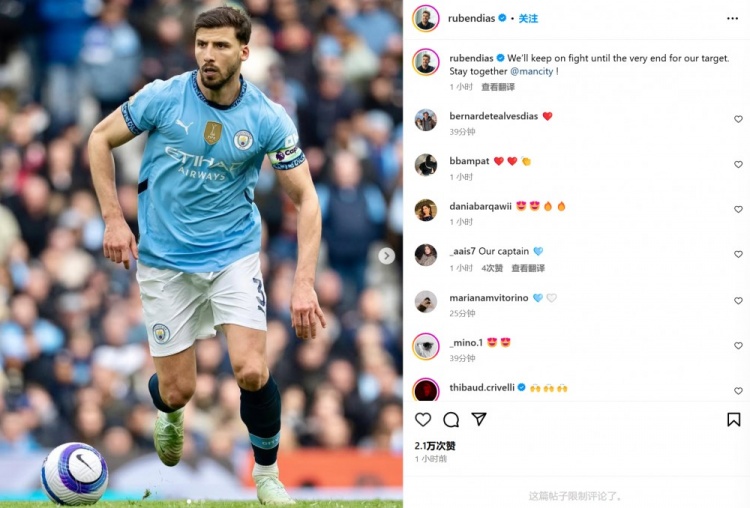 魯本-迪亞斯曬出自己的比賽照,并配文:“我們將會(huì)繼續(xù)為了目標(biāo)而戰(zhàn)斗到最后一刻。團(tuán)結(jié)起來@曼城俱樂部!”