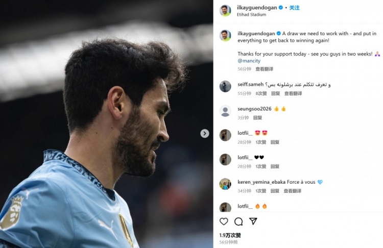 京多安表示:“我們需要汲取本場平局的教訓,并且在此后竭盡全力再次爭奪勝利。感謝球迷們今天的支持,我們兩周后再見!@曼城俱樂部”