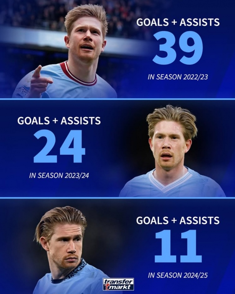 能否續(xù)約?33歲德布勞內(nèi)近3賽季參與進(jìn)球數(shù)逐年下滑:39→24→11