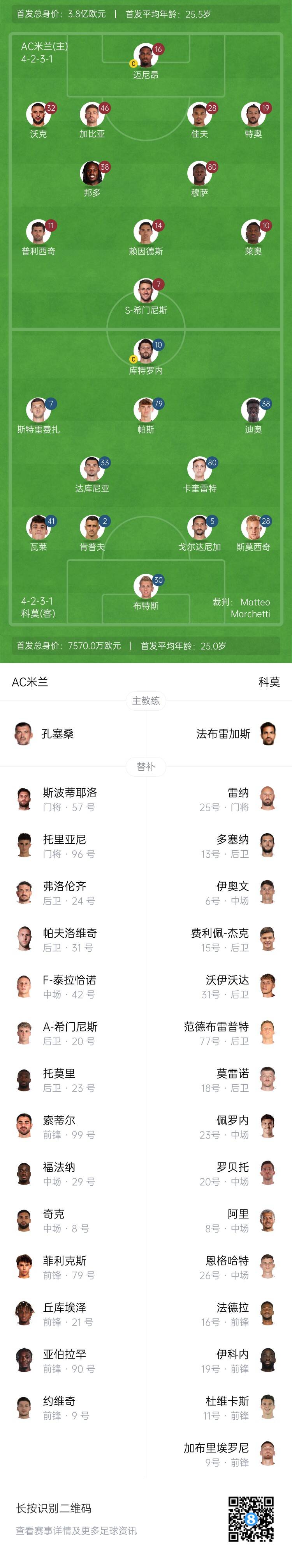 3月16日訊 意甲第29輪,AC米蘭主場(chǎng)對(duì)陣科莫。賽前,官方公布了本場(chǎng)的首發(fā)名單。