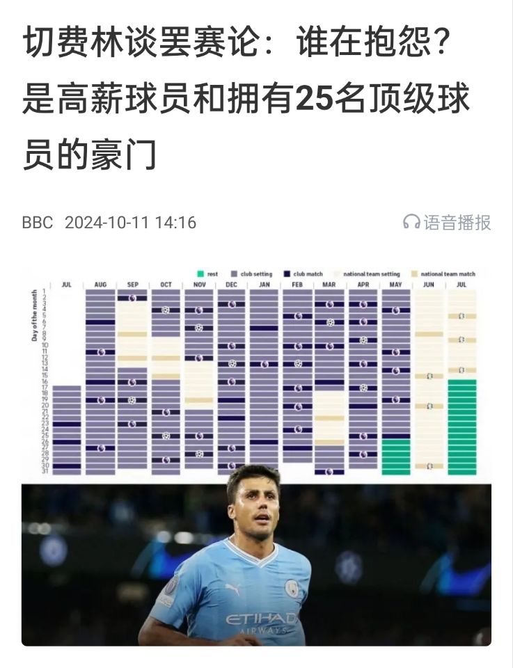 但對于這種抱怨,也存在相反的看法。比如歐足聯(lián)主席切費林曾在采訪回應(yīng),抱怨賽程最多的就是那些大俱樂部和高薪球員。但他們?nèi)找媾蛎浀母咝角∏【托枰銟凡慷嗵弑荣悂碇巍H绻麄儾辉笢p薪,那賽程縮減也很難辦。
