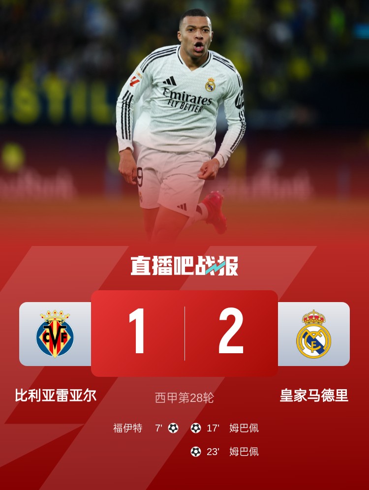 西甲第28輪,皇馬2-1逆轉(zhuǎn)比利亞雷亞爾,姆巴佩梅開(kāi)二度。